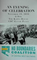 On Saturday evening, November 19, 2016, I joined other supporters and members of the No Boundaries Coalition of Central West Baltimore to celebrate their first 8 years as a growing and fruitful community organization. In addition to celebrating past achievements, the evening also launched the organization’s first Annual Fundraising Drive. Based solely on the attendance, … More No Boundaries Coalition – Evening of Celebration